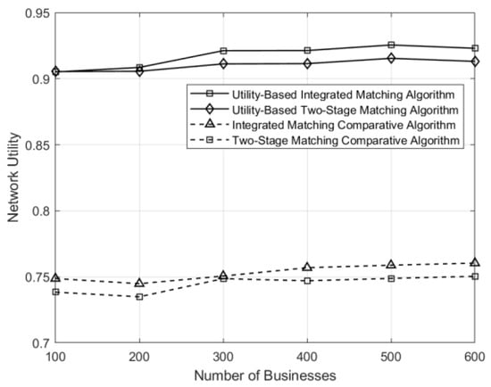 Comparison of network utility under different matching schemes across varying numbers of businesses.