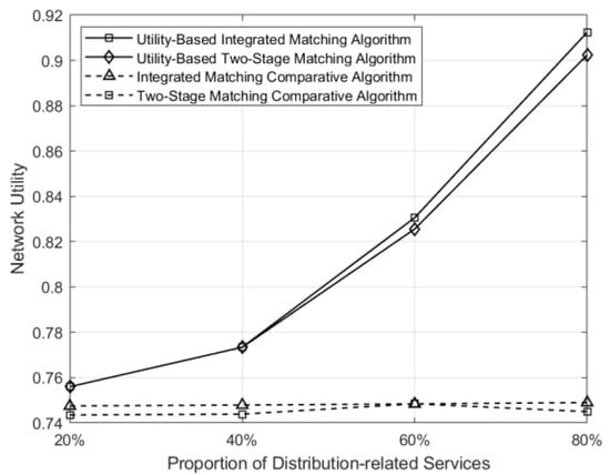 The variation of utility in the network with different matching schemes as the proportion of distribution-class businesses changes is shown in Figure 9. It can be seen that when the number of businesses remains constant and the proportion of distribution-class businesses is 20%, the difference in network utility among the four schemes is not significant. This is because distribution-class businesses have higher demands compared to marketing-class businesses. When the proportion of distribution-class businesses is low, the distribution of service-level demands among various types of businesses in the marketing class is relatively uniform in the network, and the control matching scheme also adopts uniform matching. Therefore, the utility-based matching scheme does not show a significant improvement. However, as the proportion of distribution-class businesses increases, the control matching scheme still employs uniform matching, failing to adapt well to changes in business demands. In contrast, the utility optimization-based scheme can adjust the matching probabilities according to business demands, resulting in a significant improvement in network utility.
