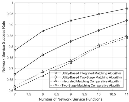 The change in business-service success rates with the number of service functions under different matching schemes in the network is shown in Figure 10. In a fixed number of businesses in the network environment, the more service functions there are, the finer the granularity of resource allocation, leading to higher resource utilization and a finer granularity of business selection, thus improving the business-service success rate. From Figure 10, it can be observed that the business-service success rates of all four matching methods increase with the increase in the number of service functions. However, under the utility-optimization scheme, the resource utilization rate is higher, leading to a higher business-service success rate. It is worth noting that an increase in the number of service functions can lead to finer granularity, resulting in more choices for businesses. In this case, the complexity of optimization also increases. Therefore, for delay-sensitive businesses, it is important to find a balance between granularity division and optimization complexity.