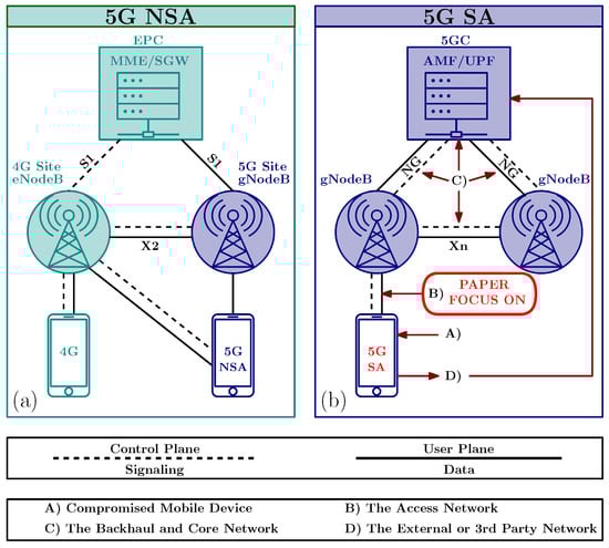 (a) SA vs. (b) NSA architecture of 5G New Radio (NR) network with possible vector attacks.