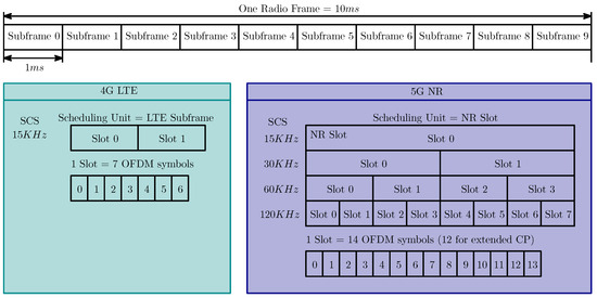 The 5G frame structure incorporates both self-contained and non-self-contained subframes, adding another layer of flexibility. This allows for different data transmission methods depending on the application requirements, maintaining service quality and further reducing latency. The 5G radio frame is 10 ms long and, the same as for the 4G, it is divided into 10 subframes with 1 ms duration. Each subframe is divided into slots, depending on which SCS is considered. Each slot contains 14 Orthogonal Frequency Division Multiplexing (OFDM) symbols in one Resource Block (RB) or 12 symbols for the extended CP. With increased SCS, the number of slots in the subframe increases because of the shorter symbol duration (from the OFDM theory, the OFDM symbol duration is inversely proportional to the subcarrier spacing). A comparison of the frame structures for 4G and 5G is depicted in Figure 3.