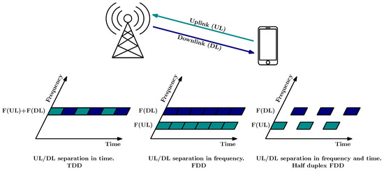 In the Time Division Duplex, as a type of half duplex scheme, a single carrier frequency is utilized for both the UL and the DL, and their separation is achieved by using different time slots. An essential aspect of any half-duplex system in general is the possibility of providing a sufficiently large Guard Period (GP) or Guard Time (GT), where neither DL nor UL transmissions occur [58]. The length of GT typically increases for stations that cover larger areas. TDD uses unpaired bands, where the UL and DL transmissions do not overlap in time, from both the device’s and the cell’s viewpoint. The benefit of TDD is the channel reciprocity assumption, allowing improved channel estimation and link adaptation, including precoding and directional antennas. This is particularly beneficial for methods like beamforming.