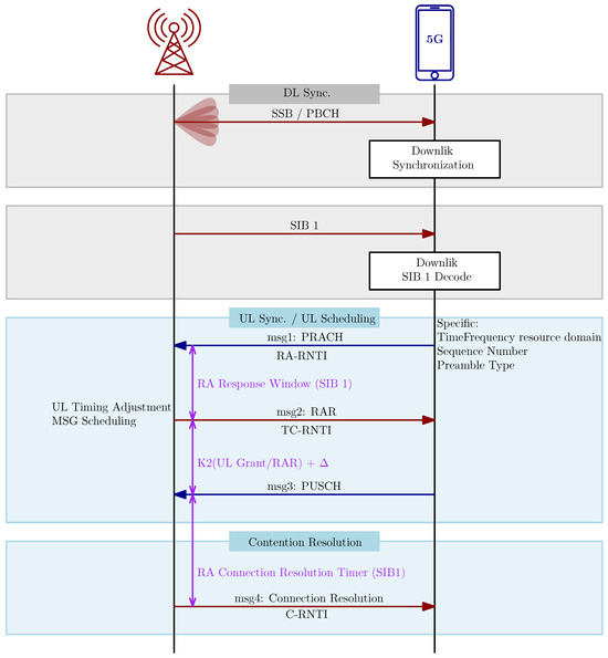The initial access [59] of 5G is a sequential procedure between the UE and gNB to acquire UL synchronization and obtain identification information for the radio access communication; the process is also known as the Random Access Channel (RACH) process. This process is initiated in several cases. The initial access is called when the UE moves from the RRC idle state, which is related to the low-power mode, to the RRC connected state, or during the RRC connected state when the UL synchronization status is marked as non-synchronized, or during the RRC re-establishment procedure, or during the transition from the RRC inactive state. The procedure is also called when the UE demands system information that is not included in broadcast packets, or when the UE establishes a time alignment at the secondary cell to improve data rates or make a more reliable connection. The initial access procedure is also called in the case of beam failure or handover between cells. The initial access procedure is depicted in Figure 5. The primary distinction between LTE and 5GNR RACH occurs right before the RACH preamble transmission. This difference arises from the default support for beamforming in NR, particularly in mmWave scenarios.