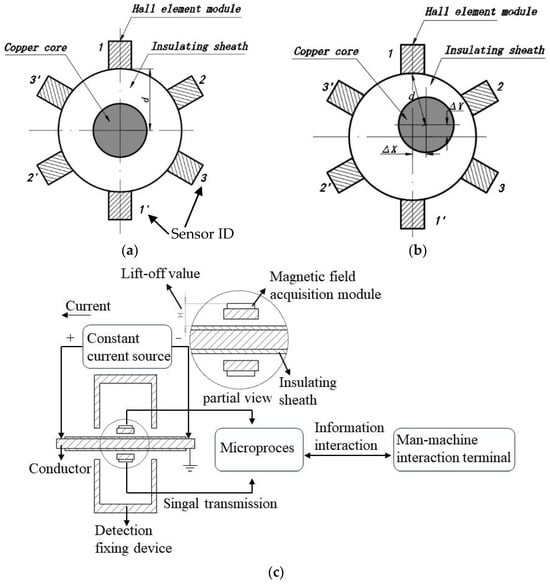 As shown in Figure 1c, the cable eccentricity-detection instrument proposed in this paper first secures the cable to be tested onto the detection fixing device. During detection, a constant current source applies an electrical current to the cable, and the magnetic field acquisition module collects the resulting magnetic field signals. Using a ring array, we perform signal collection to minimize acquisition errors and bolster resistance to magnetic interference in signal transmission [,,]. Conditioning circuits then adjust the analog signal voltage from the module to meet the requirements for analog-to-digital conversion, which is subsequently carried out by the converter []. The microprocessor processes these digital signals, calculating the magnetic flux density at the acquisition module. Employing computational methods such as the cosine theorem, inverse cosine theorem, and calculus corrections, we determine the distance d from the conductor’s center to the module and calculate the cable conductor’s eccentricity e [,,]. Through serial communication, the human–machine interaction terminal displays the cable eccentricity information [,]. Upon receiving parameter adjustment information at the interaction terminal, the detection instrument adjusts its process, facilitating two-way human–machine interaction [].