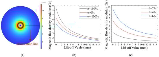 As shown in Figure 2b,c, we observe that the magnetic flux density at the detection point rapidly decreases initially and then slows down gradually as the lift-off value increases. This behavior conforms to the exponential relationship between distance (d) and magnetic flux density (B), as defined by Equation (2).
