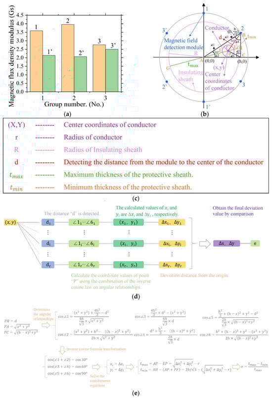 As shown in Figure 3d,e, we illustrate the cable eccentricity-detection method detailed in this paper, which calculates the distance d from the module to the conductor center, following the detection of magnetic flux density at the magnetic field acquisition module’s location. We then apply the angular relationships presented in Figure 3b, with the conditions ∠1 + ∠2 = 30°, ∠3 + ∠4 = 60°, and ∠5 + ∠6 = 90°, using the Law of Cosines and the cosine sum formula [,].