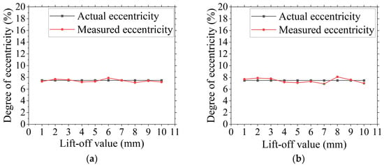 As show in Figure 5a and Table 2, the detected eccentricity at the detection position with a lift-off value H = 1 mm, using the actual measured eccentricity as the benchmark, varies between 0 and 0.3% above and below the standard line across ten experiments. The error ranges from 0 to 4%, and the numerical variation standard deviation is 0.11. Figure 5b illustrates that in the ten experiments conducted at the detection position with a lift-off value H = 2 mm, the detected cable eccentricity varies between 0.2% and 0.5% above and below the standard line. The error ranges from 2.7% to 6.7%, and the numerical variation standard deviation is 0.09.