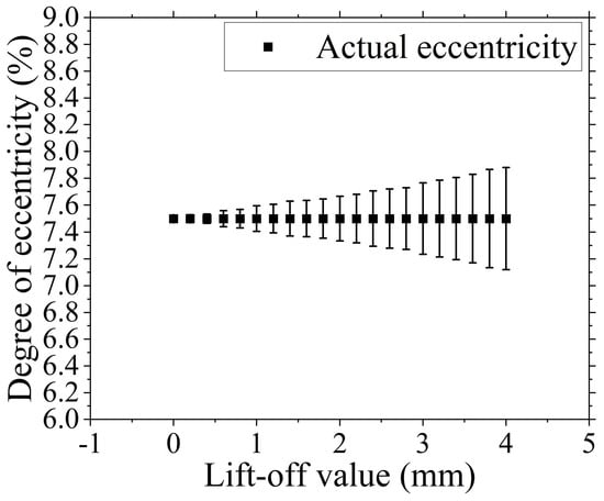 To investigate the impact of lift-off value on the detection accuracy of the cable eccentricity-detection method introduced in this paper, a lift height influence experiment is designed. The experiment sets the loading current intensity at I = 4 A and employs a height gauge to perform experiments across the lift height range of H = 0 to 4 mm, with an experimental increment of 0.2 mm, as shown in Figure 4. Conducting the lift-off value influence experiment results in the acquisition of the error bar chart presented in Figure 6, which visually represents the variation of detection error with respect to the lift-off value. Additionally, Table 3 provides the eccentricity-detection data and corresponding errors under various lift-off value conditions.