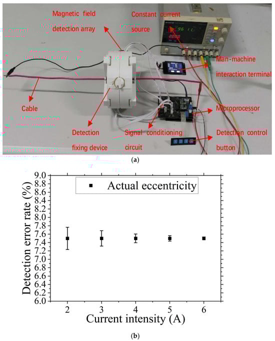 To investigate the impact of the current intensity applied to the cable on the accuracy and stability of the cable eccentricity detection, a current intensity influence experiment was designed. The loading currents were set to I = 2 A, 3 A, 4 A, 5 A, and 6 A, with a lift-off value H = 1 mm. As depicted in Figure 7, in this experiment, the cable was clamped onto the described detection fixture, and after applying different intensities of current, the designed eccentricity-detection instrument was used to perform the eccentricity detection. Using the human–machine interaction terminal to display the detection information, and receive the detection status adjustment information inputted. The experiment yielded the cable eccentricity variation chart under different currents, as shown in Figure 7 and the Table 4 showing the eccentricity-detection data and error under different current intensity conditions.