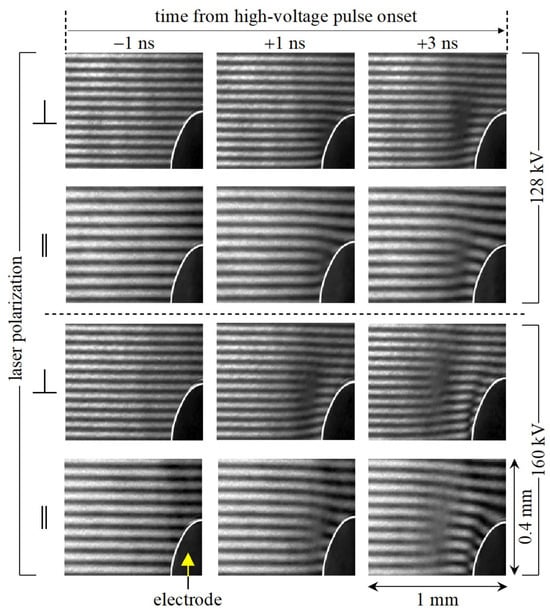 Compared with traditional electric field sensors, an electro-optic sensor has the advantages of high spatial resolution, wide frequency bandwidth, and little interference with the original field [12]. Therefore, it is widely used in the measurement of electric fields or transient voltages, such as the electric field of long air gap discharges and lightning propagation [13], and transient voltages in electric power systems [14]. Recently, Hoffer et al. reported the detection of a transient electric field with high spatiotemporal resolution [15]. The phase shifts caused by the Kerr effect are characterized by interference fringe shifts using a Mach–Zehnder interferometer with a picosecond laser pulse as the source and the camera as the detector. As shown in Figure 2, the interference fringes in the imaging area of 1 mm × 0.4 mm have an obvious shift after turning on the high-voltage pulse. The different directions and strengths of the electric field cause the change in the interference pattern near the electrode. This image-based detection method converts the change of the refractive index to the distinct interference fringes, which is more obvious than the traditional Mach–Zehnder interferometer shown in Figure 1. The spatial resolution is about 1 μm, and the temporal resolution depends on the width of the laser, which is 35 ps. This ultrafast detection method is highly valued in partial discharge analysis.