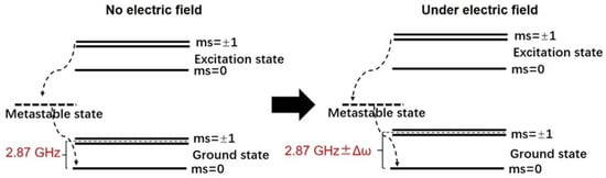 The NV center is very sensitive to small variations in external magnetic field, temperature, electric field, etc. Electric field or voltage measurements based on NV center technology utilize the unique properties of NV centers in diamond crystals. For electric field measurement, the Stark effect determines the variation in the energy gap between the ms = 0 and ms = ±1 states, as shown in Equation (3) [32]. It is clearly seen that the energy gap (2.87 GHz ± Δω) can be tuned under different electric fields, as shown in Figure 5, leading to the peak shift in the ODMR spectrum. Usually, the change in the ODMR frequency is determined after proper calibration.