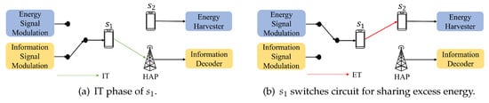 With the advancement of antennas, a technology called SWIPT (Simultaneous Wireless Information and Power Transfer) [,] has emerged, which allows the sender to simultaneously transmit the energy signals and the information signals to the receiver. For example, in the ET phase, the HAP can transmit both the energy and information signals to the wireless stations at the same time, and the wireless stations can harvest energy and decode information. The SWIPT scheme can be classified mainly into two types: Time Switching (TS) and Power Splitting (PS), which are shown in Figure 2a and Figure 2b, respectively. When the antenna receives the signal, TS can switch the circuit to direct the signal to the charging circuit or the information receiving circuit by the time. On the other hand, when the antenna receives signals, in the PS type, the signals are directed to the power splitter, and the received signals are directed to the charging circuit and the information receiving circuit according to different proportions through the power splitter.