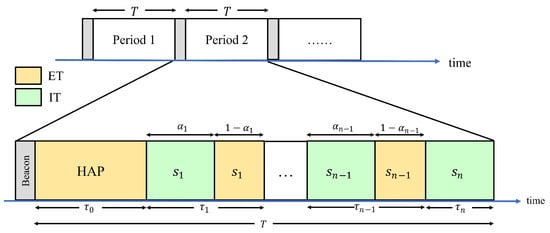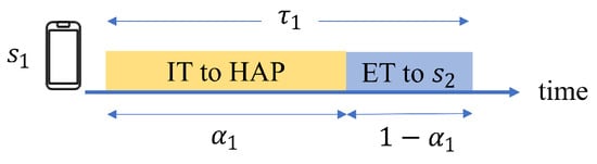 Figure 4 is the timing diagram of the transmission of in the above example. Assume that is the transmission time of . In , there will be a ratio of for information transmission, and the remaining is used to share excess energy to other stations which have not transmitted to the HAP.