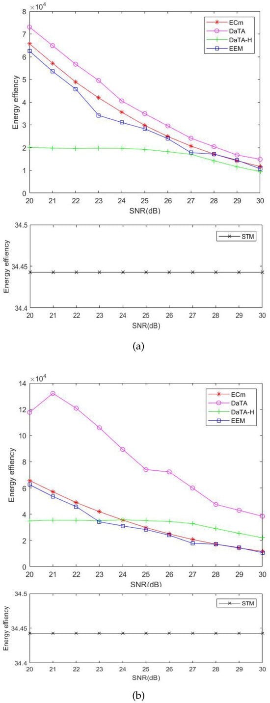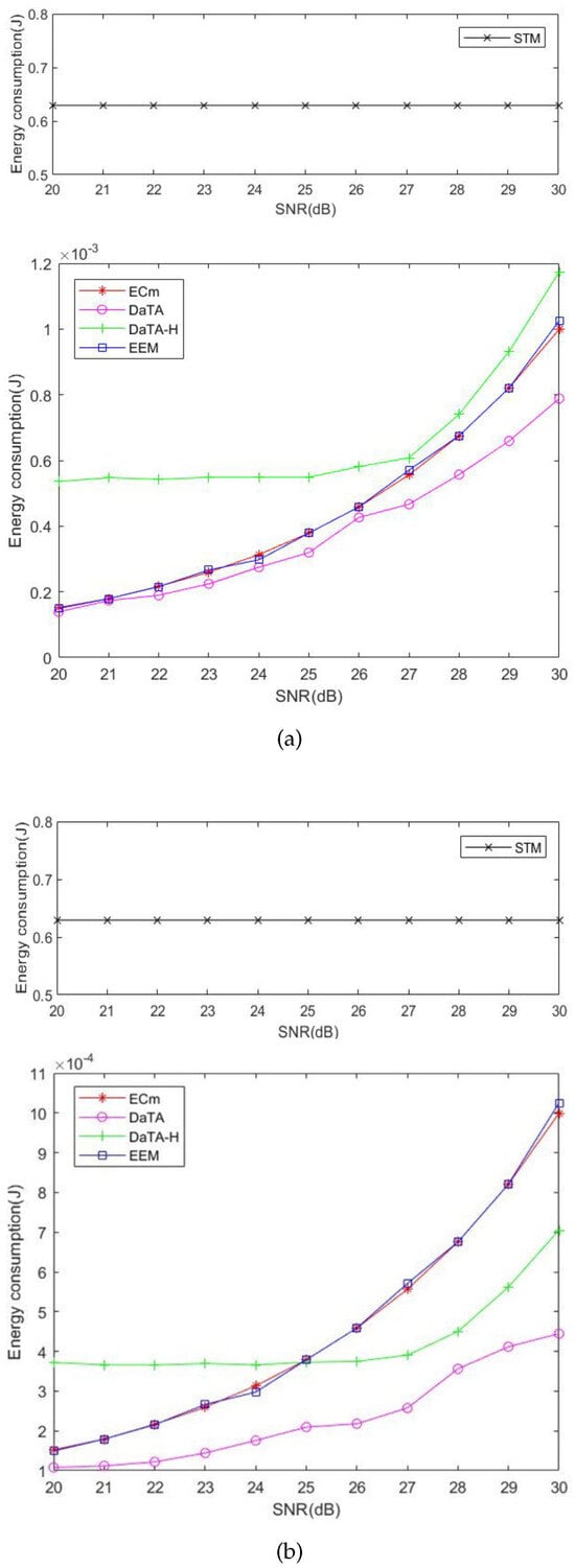 - Two scenarios, special scenarios and general scenarios are conducted in the simulation to verify the advantages of the proposed schemes. We compare the DaTA and the DaTA-H schemes proposed in this paper against the STM, EEM, and ECm models of the related works. From the simulation results, it can be concluded that the DaTA scheme has better performance in the energy consumption and the energy efficiency in both general and special scenarios. In special scenarios, when the SNR threshold reaches a certain value, the energy consumption and the energy efficiency of the DaTA-H scheme are also better than those of the related works.
