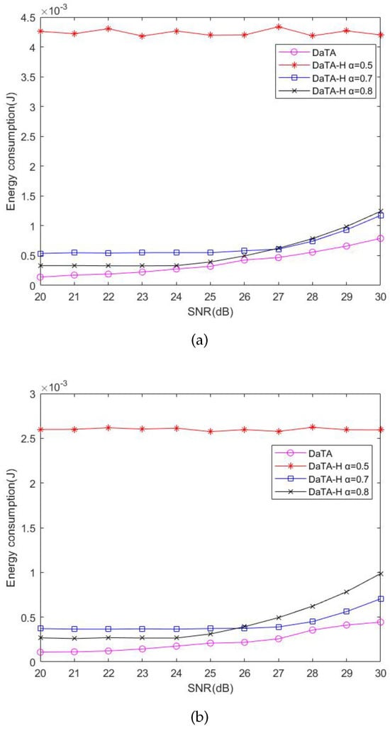 Comparisons of network energy consumption of the DaTA-H scheme with different . (a) The general scenario. (b) The special scenario.