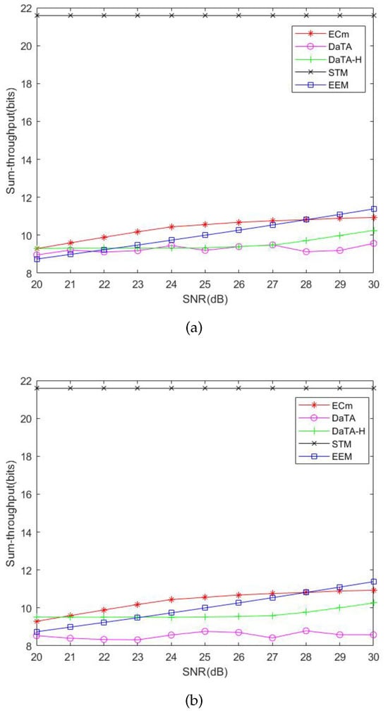 Figure 9a and Figure 9b illustrate the comparisons of the network sum-throughput of the DaTA-H scheme with different values in the general and the special scenarios, respectively. When is 0.8, the sum-throughput of equal to 0.8 is higher than that when is 0.5 and 0.7. It is because, in the case of is 0.8, the time ratio of the wireless station to transmit data is longer than that when is 0.5 and 0.7. Even though the wireless station can obtain more energy when , its sum-throughput is still lower than that when equals 0.7 or 0.8 due to a larger proportion of time for energy sharing. In addition, when the SNR threshold is within a certain range, the sum-throughput of the DaTA-H scheme is almost the same. The reason is that all the wireless stations share the energy with a fixed proportion of the transmission time. The wireless stations farther from the HAP can better meet the SNR threshold. Therefore, the wireless stations only need to meet the throughput demand. In Figure 9b, wireless stations are close to each other in the special case, wireless stations can obtain more extra energy from others. However, the DaTA scheme uses an optimized method to obtain the result of time allocation. Therefore, the IT time allocated for the wireless station far from the HAP is just enough for the station to transmit the data in demand. As a result, the sum-throughput of the DaTA scheme is not as good as that of the DaTA-H scheme.