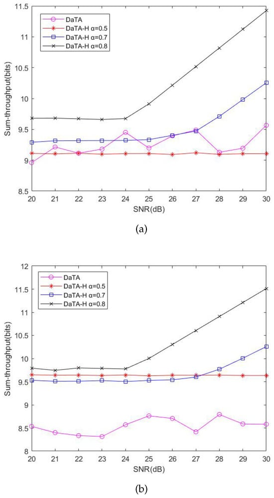 Comparisons of the network sum-throughput of the DaTA-H scheme with different . (a) The general scenario. (b) The special scenario.