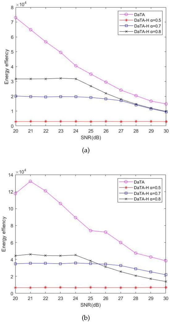 Comparisons of the network energy efficiency of the DaTA-H scheme with different values. (a) The general scenario. (b) The special scenario.