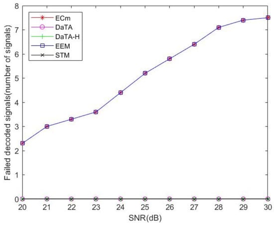 In a general communication network, if the SNR value of a received signal is too low, it may affect the transmission speed and even cause decoding problems. Therefore, a successful transmission requires that the SNR value of the received signal should be larger than or equal to a certain SNR threshold. If the SNR value of the received signal is smaller than the SNR threshold, the signal may be regarded as a noise [,]. In a general data network, the SNR value of a received signal needs to be larger than 20 dB [].