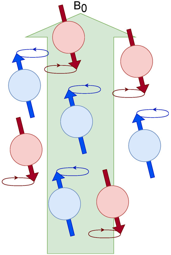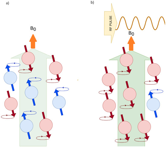 Figure 2. (a) Spin population distribution before the application of an RF pulse or polarizing coil in an external magnetic field Bo. Not all spins are aligned with Bo, leading to net magnetization. (b) Spin population distribution after the application of the RF pulse or polarizing coil. The pulse causes some spins to transition to a higher energy state, partially inverting the spin population, but not all spins are fully inverted. This diagram reflects the Zeeman energy levels and the alignment of nuclear spins with the external magnetic field. A radiofrequency (RF) pulse perturbs the nuclear spins from their equilibrium state, which are “on resonance”.