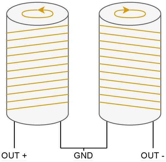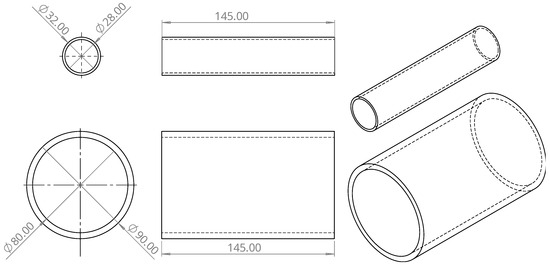The first part designed was the cylinder of the polarizing coil. This cylinder has a height of 145 mm, an outer diameter of 90 mm, and an inner diameter of 80 mm. Two holes with a diameter of 2 mm were made 20 mm from the base to allow the coil wire to pass inside the cylinder. The second part designed was the cylinder of the receiving coils. This cylinder has a height of 140 mm, an outer diameter of 32 mm, and an inner diameter of 28 mm. Similarly to the polarizing coil cylinder, this cylinder also has two holes made 20 mm from the base, but this time with a diameter of 1.5 mm to allow for the coil wires to pass inside the cylinders. Figure 4 shows the CAD design of the polarizing coil and the receiving coil cylinders.