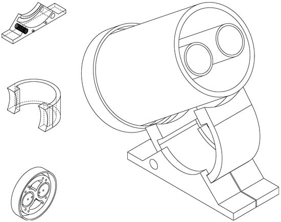 In order to be able to modify the inclination of the coils, and to be able to align the terrestrial magnetic field in an optimal way, a support was designed, which holds the excitation coil and allows one to modify the angle with the base. The base of the equipment has a curved surface where the support can slide and two fixing screws, which allow us to secure the mounting in the desired position. The fixing screws used are plastic, so there is no need for any metal component that could alter the magnetic field near the coil. Figure 5 shows the CAD design of the various parts and the assembled model.