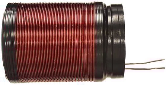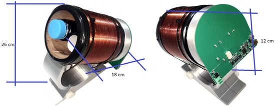The polarizing coil temporarily creates a polarizing magnetic field B p . This field quickly turns off, leaving the magnetization instantly perpendicular to the Earth’s magnetic field around which precession begins [53,54]. The polarizing coil and its supporting structure must not contain any ferromagnetic material, see Figure 7. Naturally, the Earth’s field is very homogeneous, and if there is any ferromagnetic material near the coil, it will change the uniformity of the field, causing magnetic field inhomogeneities. To properly use the device during normal experiments, the entire system should be free of electromagnetic interference due to the weakness of the detected signal. However, since the goal of this project is to design a benchtop device, it has been designed to be robust under electromagnetic stress conditions. The purpose of the polarizing coil is to produce a magnetic field much greater than the Earth’s magnetic field. To polarize the sample, a current of approximately 10 A is passed through the coil for 10 s. Therefore, the wire for winding the polarizing coil must have a large-enough cross-section to avoid heating while carrying this current. The specifications chosen for the polarizing coil are given in Table 2.