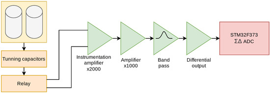 The filtered signal undergoes an additional amplification stage before being acquired by the microcontroller Σ Δ -ADC. Finally, signal processing is implemented on these data to extrapolate and visualize the desired magnetic resonance information.