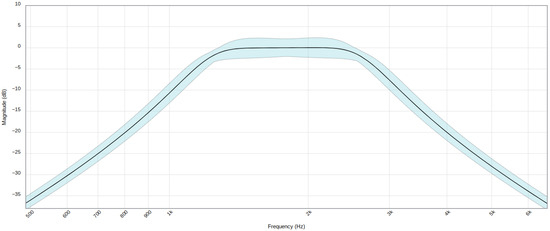Figure 15. Filter stage frequency response. Blue band shadow includes components’ tolerances.