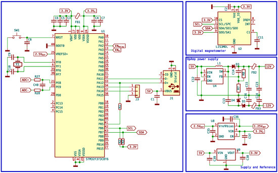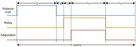 The polarizing coil cylinder is wound on a commercial PVC (vinyl polychloride) tube. The polarizing coil is placed in the center of the coil holder, which is provided with holes for passing the connections to the PCB, placed under this holder. The base, inclination part, and coil support are made of PETG, avoiding the use of metal. The tilt platform should form an angle close to 50° relative to the base. The angle ensures that when B p is turned off, the magnetization is perpendicular to the Earth’s field immediately prior to signal detection. This geometrical arrangement maximizes the strength of the signal. The Earth field in southern Spain (University of Almeria) has an inclination of 50.57° and a declination of 0.59°.