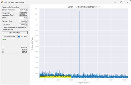 Figure 20. 1H MR spectrum test was successfully conducted. The magnetometer detected a magnetic field strength of 37.10 μT, resulting in a resonance frequency of 1579 Hz for the 1H nuclei.