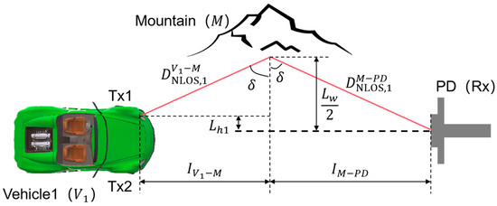 In the proposed V2I–VLC system model, the path loss of the NLOS links is divided into two parts, M and RS, based on the reflected objects. In the same way, the overall path loss of the NLOS links can be expressed as follows: