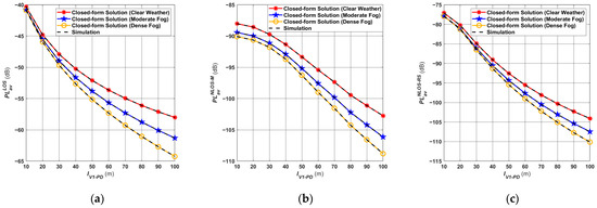 Average path loss of (a) LOS link; (b) NLOS-M link; (c) NLOS-RS link under different weather conditions [(−) sign in the path loss value indicates that the path loss is in the form of a penalty].