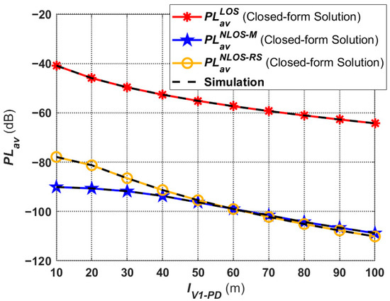 In this section, the V2I–VLC path loss expressions for LOS and NLOS links are derived based on the channel modeling in Section 2, and (5) and (9) in [48]. The weather factor and other propagation characteristics are taken into account. In addition, novel closed-form expressions for the average path loss are derived.
