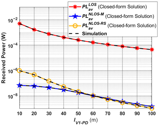 In this subsection, the received optical power performance corresponding to the proposed V2I–VLC propagation model is discussed. Figure 8 gives the received optical power in different links under moderate fog conditions based on (16), (17), and (18). It can be seen that the received optical power is highly correlated with the average path loss, and they are directly proportional to each other. Thus, the trends of the received optical power curves shown in Figure 8 are consistent with those in Figure 7. Meanwhile, in the total received power at Rx, the received optical power from the LOS link is much larger than the received optical power from the two NLOS links. In addition, when V1 is at a close distance from Rx, under the same conditions, the NLOS power caused by the reflection from RS is larger than that caused by the reflection from M. This is mainly due to the fact that the NLOS propagation distance of the rays reflected by the road surface ( and ) is smaller than the NLOS propagation distance of the rays reflected by the mountain ( and ) during the light propagation process. Additionally, when V1 and Rx become gradually farther away from each other, the received optical power of the two NLOS links is also basically the same because the propagation distances of the rays are not very different.