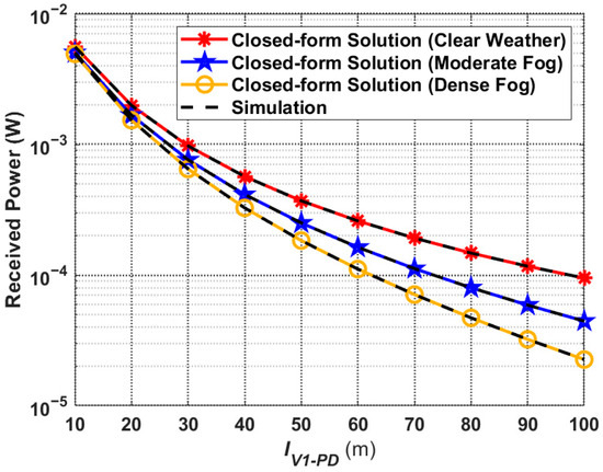 The total received optical power of the V2I–VLC system, based on (19) as well as the simulation curves under different weather conditions, are presented in Figure 9. It can be seen that the total received optical power is the largest in clear weather conditions and the smallest in dense fog conditions. Moreover, the further the distance between V1 and Rx, the larger the difference in total received optical power. For example, when , the total received optical power in dense fog conditions is only about 12.5% lower than it is in clear weather conditions. However, when , the ratio reaches 76.2%. This is due to the fact that, the further away V1 is from Rx and the worse the weather conditions are, the more the light from the headlights is affected, making the performance of the V2I–VLC worse as well.