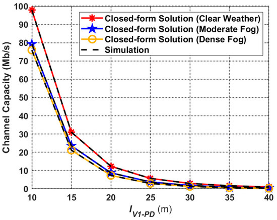 In this subsection, the channel capacity performance corresponding to the proposed V2I–VLC propagation model is discussed. Figure 10 illustrates the relationship between the channel capacity (maximum data rate) and the transmission distance based on (22), and also the simulation curves. First, it achieves the highest capacity at all transmission distances in clear weather conditions due to better average path loss performance compared to foggy weather. Second, transmission distance has a great impact on the channel capacity of the proposed V2I–VLC propagation model. For example, under clear weather conditions, the channel capacity at is about 87.4% lower than the channel capacity at . Additionally, when (compared to ), this ratio reaches 98.9%. Furthermore, with the increasing transmission distance, the effect of weather conditions on the channel capacity becomes less significant. For instance, Figure 10 shows that when , the channel capacity of the moderate and dense fog is about 18.6 Mb/s and 21.9 Mb/s lower than that of the clear weather, but, when , the difference is only 3.6 Mb/s and 5.0 Mb/s. It reveals that, for the proposed V2I–VLC propagation model, the transmission distance is a more influential factor than the weather conditions in terms of the performance of the channel capacity.