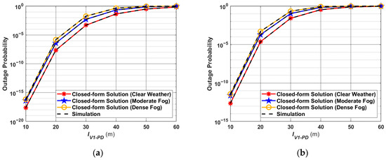 In this section, the performance of the proposed system in terms of path loss, received power, channel capacity, and outage probability will be demonstrated. To validate the accuracy of the derived theoretical expression in the previous sections, a numerical simulation is conducted using MATLAB® software, version R2023a. Since weather conditions have a significant impact on outdoor V2I–VLC systems, they are considered in the discussion. In the simulation, corresponding to each value of , channels are considered. In addition, all the simulation parameters related to the proposed V2I–VLC system are referred to in Table 2.