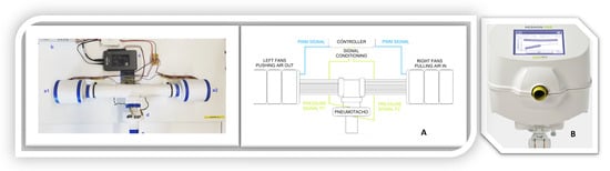 In this study, both low-frequency and high-frequency devices are used to evaluate respiratory function. The low-frequency prototype device (4P-FOT), shown in Figure 1A, measures in the 0.2–2 Hz range, providing detailed insights into lung viscoelastic properties and airway remodeling []. The high-frequency commercial device (RESMON Pro Full), depicted in Figure 1B, operates in the 5–37 Hz range, offering a broader analysis of airway resistance and reactance and capturing dynamic respiratory mechanics changes under different physiological conditions [].