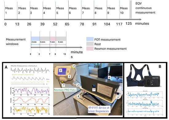 Upper graph: Illustration of the two-hour measurement protocol. Bottom: (A) Clinical setup comprising two FOT devices with their inputs and recorded signals. The RESMON Pro Full is a standalone device with two parts: the device (1) and an arm holder (2). It features a touchscreen display (3) for user interaction and a USB port (4) for data storage. The 4P-FOT device, used at lower frequencies, is mounted on an adjustable table (5) and is connected to a laptop (6) with built-in programs and a user interface. A single-use disposable mouthpiece (8) is connected to a slot (7) for each measurement. (B) The EQV real-time physiological signal monitoring sensor and the recorded signals.
