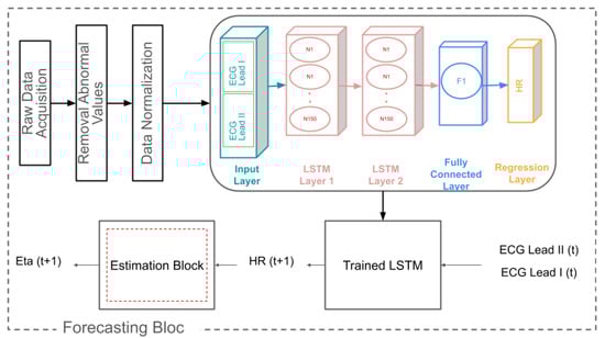 Once the data are preprocessed, they are used as input for a forecasting model based on LSTM networks. The model architecture consists of two LSTM layers, each comprising 150 hidden units. These layers are designed to capture the temporal dependencies in the ECG data, which is essential for accurately predicting HR. Following the LSTM layers, a fully connected layer maps the learned features to the output size, corresponding to the forecasted HR values for the next time step. A regression layer is then used to compute the loss between the predicted and actual HR values during training.