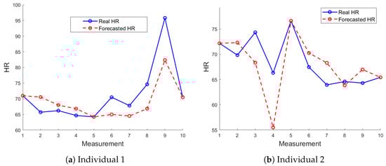 Figure 10 illustrates the LSTM-forecasted HR compared to the actual HR values recorded during RESMON device monitoring. Figure 10a,b present the results for Individual 1 (62% fit) and Individual 2 (56% fit), respectively. Both figures show a good degree of accuracy, with the forecasted HR values closely following the actual values.