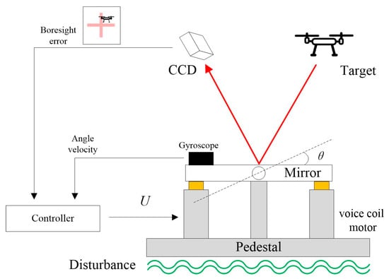 The configuration of the CCD-based OTS is illustrated in Figure 1. The target light is reflected through a fast steering mirror and enters the CCD for imaging. The controller drives the deflection of the fast steering mirror based on the boresight error calculated by the image processor to track the target and suppress the external disturbance. Usually, the mirror is driven by voice coil motors with high bandwidth, linearity, and precision. In order to ensure the inertial stability of the system, additional inertial navigation devices are usually added to the OTS to improve control performance.