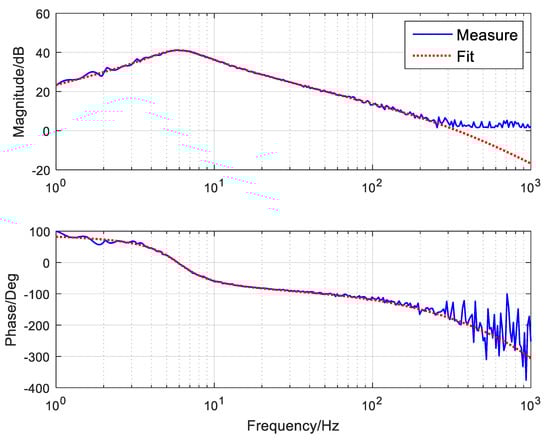 In Equation (19), is the gain of the object, is the natural frequency, is the damping ratio and is the electrical constant. To obtain the model parameters of the system, we first need to obtain the velocity open-loop bode curve of the system through the frequency sweep method, as shown in Figure 6. The blue curve represents the actual measurement, and the red represents the fitting curve. By frequency fitting, we can determine the approximate parameters of the characteristics of open-loop objects, as shown in Equation (20).