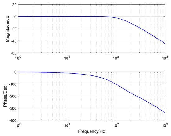 Based on , we can use the zero-pole elimination method to design a velocity controller. The velocity closed-loop bode curve of the system is exhibited in Figure 7. It can be seen that the velocity closed loop could eliminate the open-loop object resonance and make the inner-loop bandwidth exceed 100 Hz, which is much higher than the bandwidth of the outer loop. Therefore, the velocity closed loop can be regarded as an ideal object in a wide frequency domain, and the open-loop position object changes to be an integral link plus a delay item represented by .