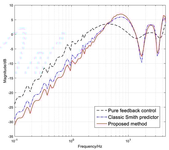 It should be pointed out that the improvement in the low-frequency tracking performance of the delay system by the Smith predictor is foreseeable, but the controller gain of the system still cannot be achieved significantly because such matching between the real object and the constructed model in practice can seldom be achieved. After considering the mismatch, the gain of the controller is limited to guarantee the system stability and the improvement effect of the Smith predictor on the system’s tracking performance will be determined by the degree of model mismatch between the real object and the model. Due to the imprecise modeling in the mid-to-high frequency region and the presence of parameter perturbations during system operation, it is also difficult to obtain sufficient tracking accuracy using the classic Smith predictor-based methods.