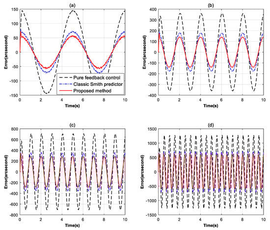 To evaluate the tracking performance under different control methods, we used the error suppression ratio as the main evaluation indicator, which is obtained by comparing the error value to the input signal. A smaller error suppression ratio represents stronger tracking performance. Figure 8 exhibits the error suppression ratio curves of the pure feedback control, the classic Smith predictor and the modified Smith predictor by the pseudo feedforward control. It can be seen that the Smith predictor’s ability to separate time delays has brought a −4 dB improvement to the error suppression capability. However, although the classic Smith predictor could promote the tracking ability compared with the feedback control, the improvement is still not enough due to the limitations in the model mismatch. After the proposed modified Smith predictor is added into the system, compared with the classic Smith predictor, the tracking ability of the system has continued to improve by approximately −2 dB below 4 Hz. Although the proposed method does not improve the high-frequency performance, it still meets our requirements as our main focus is on the low-frequency performance of the system. Figure 9 shows the comparison of the real time-domain tracking errors with given target signals in different frequencies. Obviously, with the proposed way, the residual error is significantly reduced in the low-frequency domain.