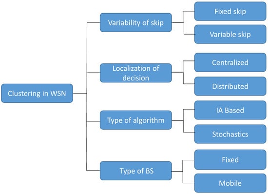 Considering how clustering can be applied to the management of WSNs, it can be developed in several ways. Consequently, Figure 1 shows some of the most common approaches for clustering of WSNs.