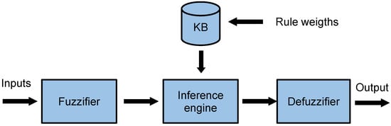 Fuzzy logic [25,26] is applied to numerous scientific fields and to engineering in multiple types of applications, including denial-of-service cyber-attacks [27], flying ad hoc networks [28], microgrid systems [29], electric vehicles [30], and earthquake control [31], among others. The well-known structure of a fuzzy controller can be observed in Figure 2. A fuzzy controller is characterized by a knowledge base (KB) that contains the fuzzy rules that relate the input variables to the output variables. These rules are formed by a series of linguistic variables whose values represent the design of the fuzzy sets for any quantity or information that the fuzzy controller needs. In order to use the value of an input variable in the fuzzy controller, its crisp value must be first fuzzified, transforming this numerical value into a membership degree of the different fuzzy sets. These fuzzy values are then put together using the rules of the KB to obtain the fuzzy values of the output variables, which are defuzzified to obtain the final output of the fuzzy system. For this proposal, we decided to use a Mamdani system, so that the final output is the centroid of the aggregated output fuzzy sets.