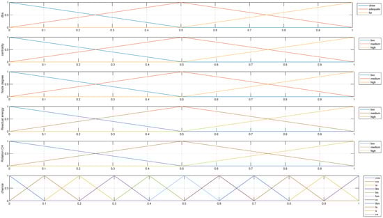 We defined 11 fuzzy sets for the output variable, because the number of output fuzzy sets depends, to some extent, on the number of rules. Therefore, when there are many rules, the number of fuzzy sets should be increased. When the number of inputs is small and has few sets, there are few rules and the output is usually in five sets, when the number of inputs is increased, the output is usually increased. In [39], the fuzzy system used four inputs, and consequently the output variable was composed of seven fuzzy sets. In our case, by increasing the number of inputs to five, we decided to increase the number of fuzzy sets of the output to 11, thus also increasing the variability, which allows greater adaptability in the optimization process. In particular, triangular sets were used because they also provide an immediate solution to the optimization problems that arise in fuzzy modeling [40].